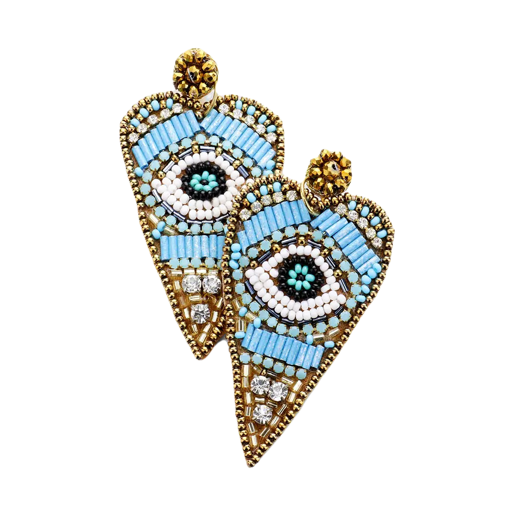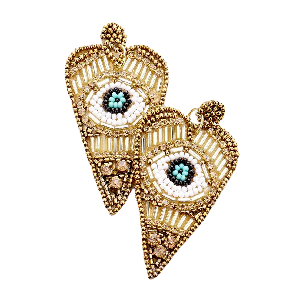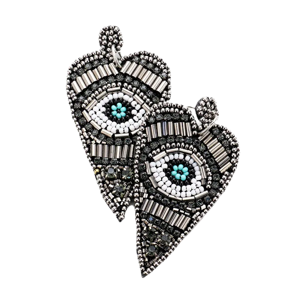 Our Heart Eyes Earrings! Stunning pieces feature a protective eye nestled within a heart design, embellished with dazzling crystals and intricate seed beads. Available in gold, turquoise, black, and silver tones, each pair combines elegance with a symbol of protection. Choose your hue and adorn yourself with these chic earrings.